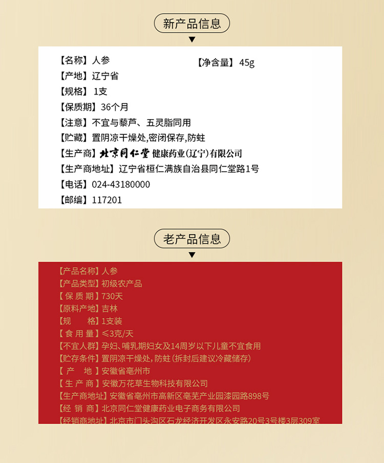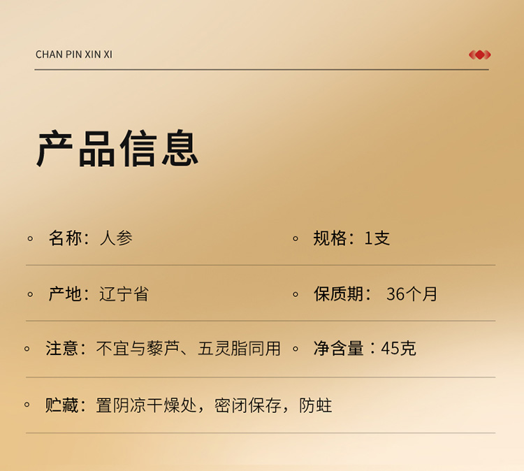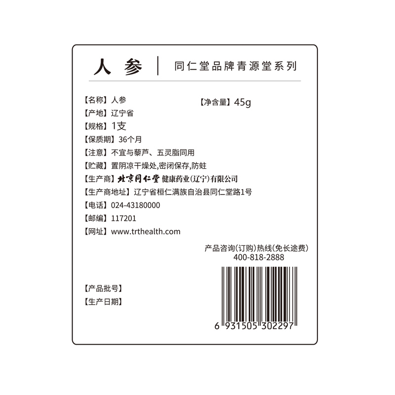 同仁堂健康药业出品 青源堂人参45克 Q1000060 初级农产品