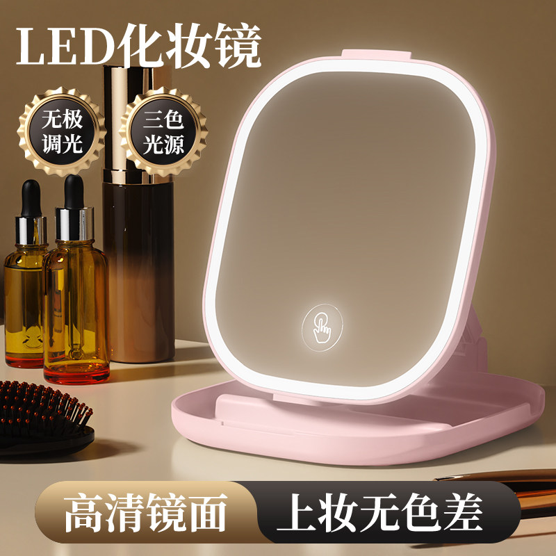 LED化妆镜带灯女生桌面梳妆镜学生宿舍便携充电折叠补妆镜