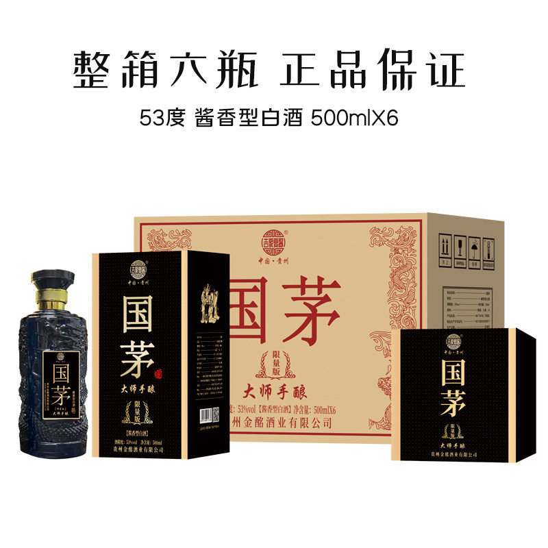 国茅大师手酿53度酱香型整箱500ml*6瓶赠送3个高档手提袋